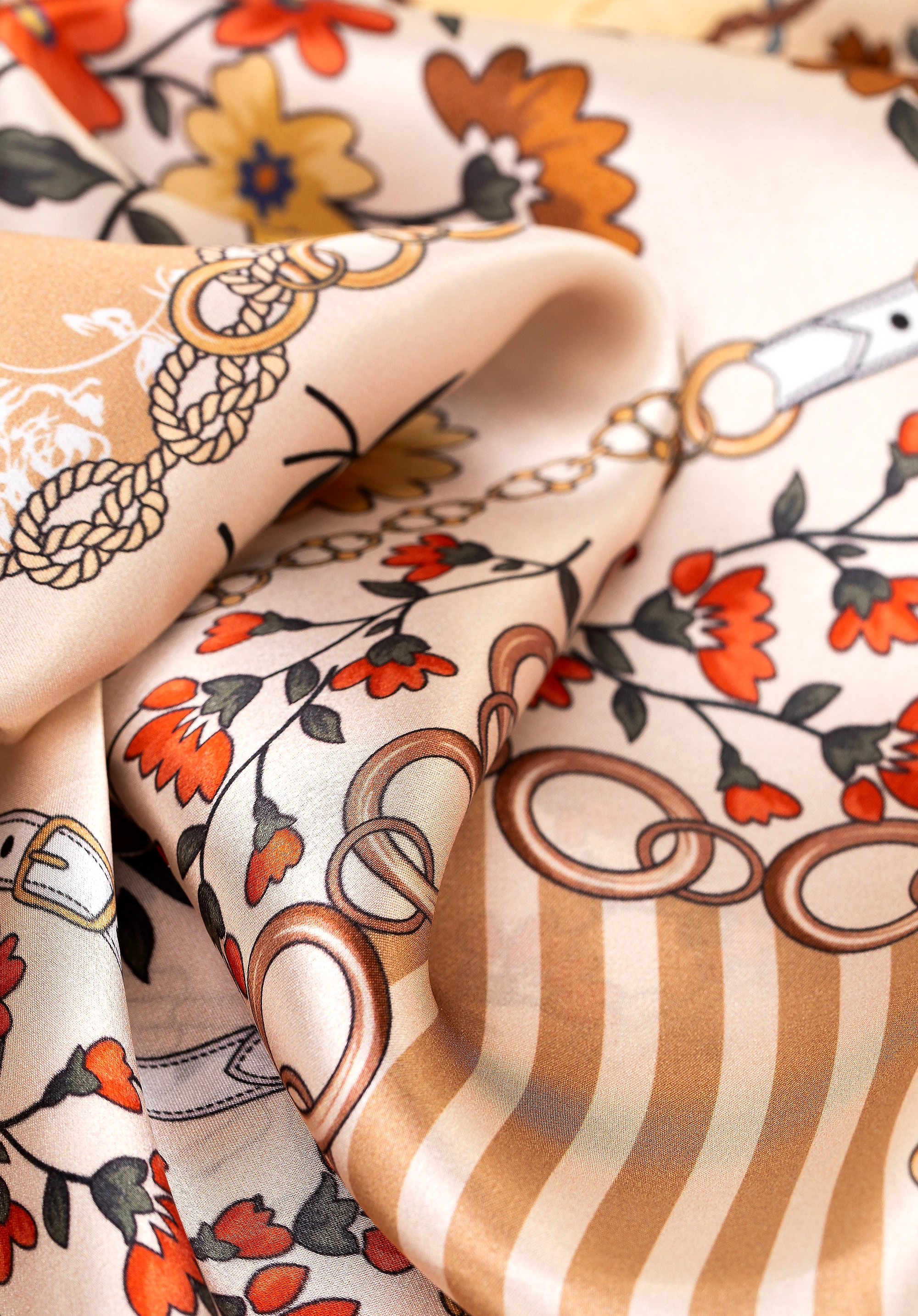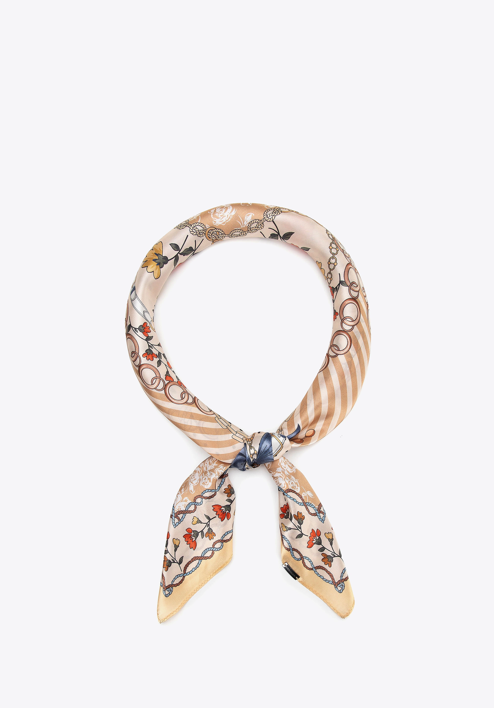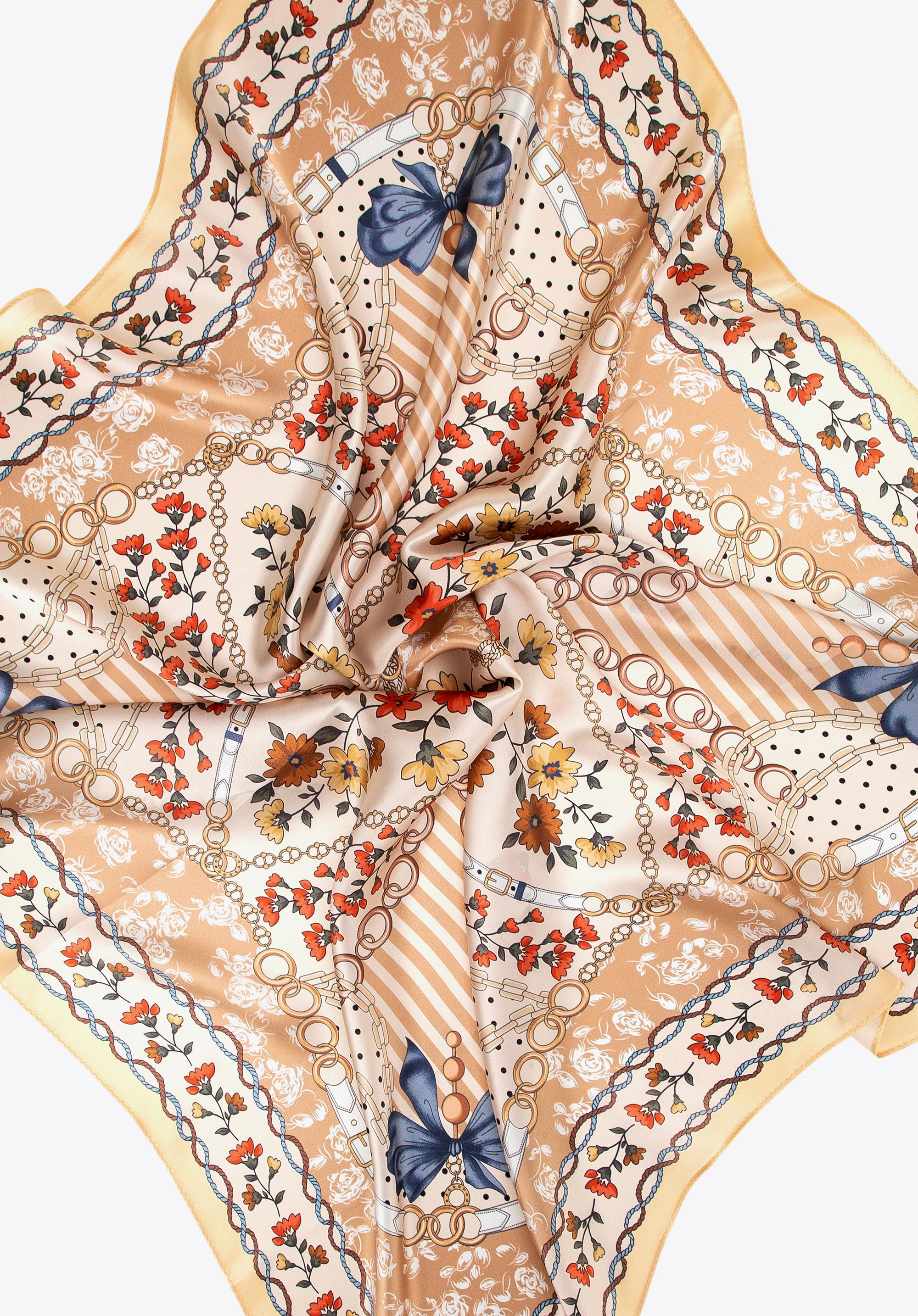 Jedwabna chusta damska w kwiaty zapewnia elegancki wygląd i wyjątkowy komfort noszenia każdego dnia. Model WITTCHEN 103-7D-S02-X1 to stylowy dodatek wykonany z naturalnego jedwabiu, który pięknie układa się na sylwetce i podkreśla kobiecy charakter stylizacji. Wielokolorowy wzór w ciepłej kolorystyce łączy motywy kwiatowe z dekoracyjnymi detalami inspirowanymi łańcuchami i wstążkami, dzięki czemu chusta prezentuje się ponadczasowo i elegancko.