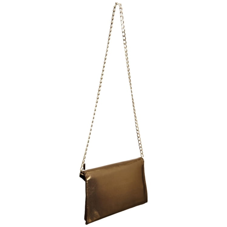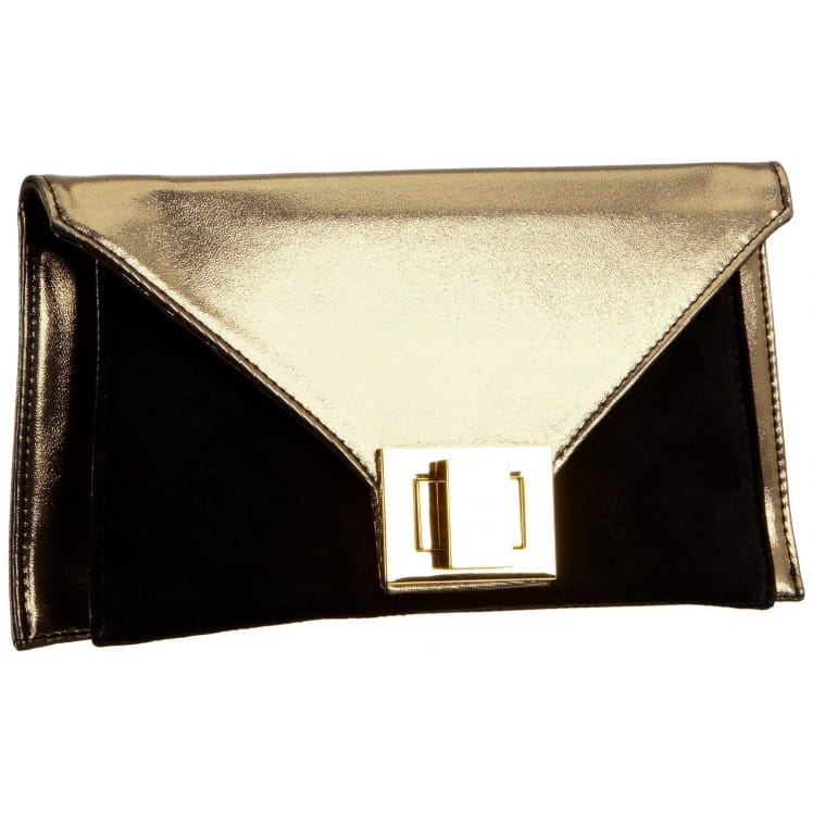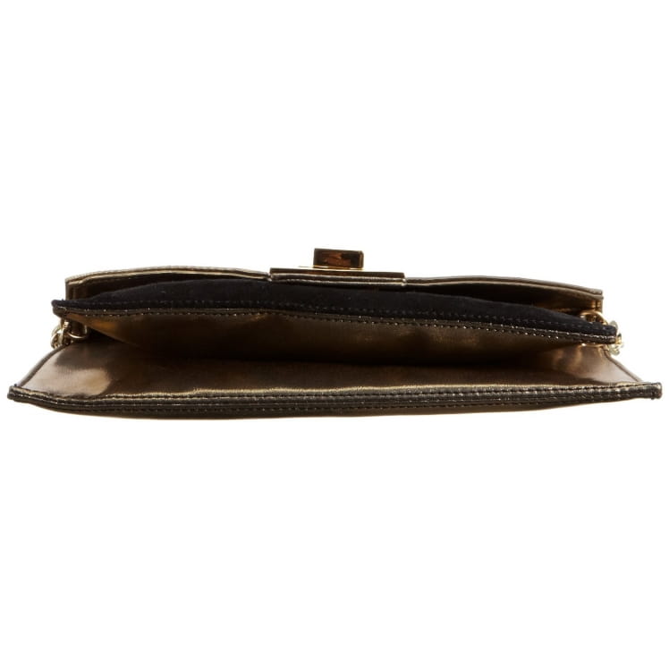 Wizytowa kopertówka MENBUR 832190010 w kolorze czarno-złotym, zamykana na klapkę z ozdobnym zapięciem. Wykonana jest ze skóry naturalnej połączonej z zamszem. W środku znajduje się dwie komory główne i kieszonka zamykana na suwak. Metalowe elementy są w kolorze złotym. Torebka przeznaczona jest do noszenia w ręce lub na ramieniu.