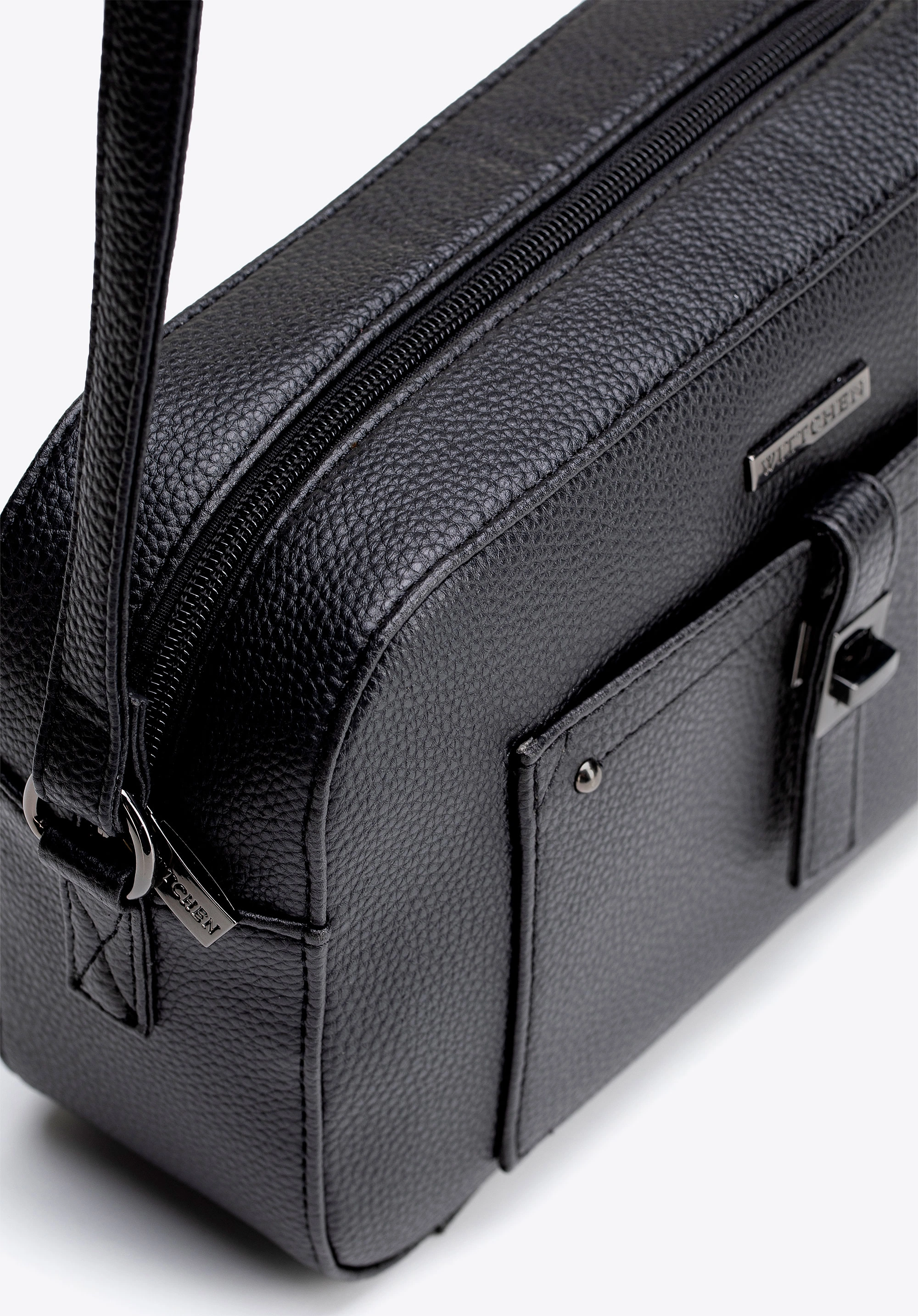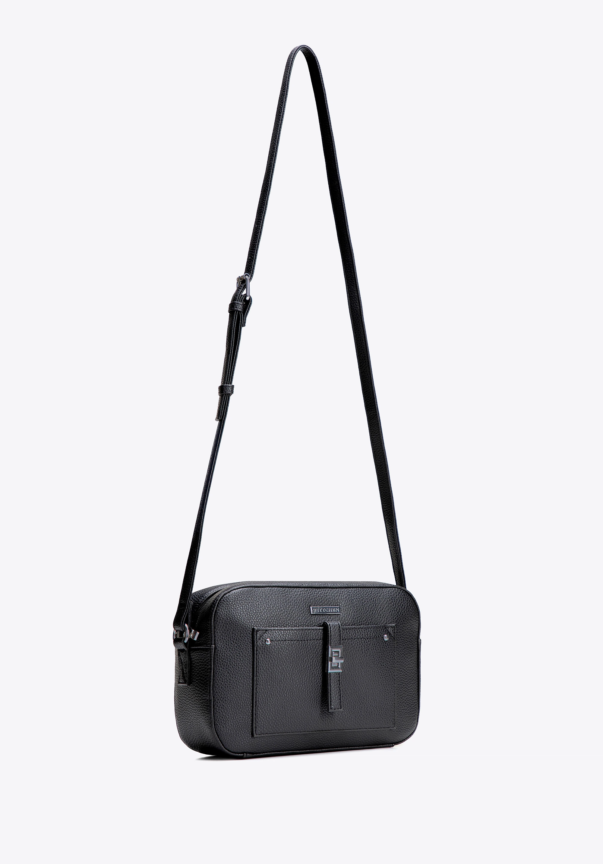 Wykonana z wysokiej jakości skóry ekologicznej o groszkowej fakturze, prezentuje się elegancko i jest odporna na codzienne użytkowanie. Czarny kolor z grafitowymi okuciami sprawia, że łatwo dopasujesz ją do różnych stylizacji. Na froncie znajduje się ozdobna kieszeń z klamerką i nitami, która podkreśla charakter modelu i zwiększa funkcjonalność.