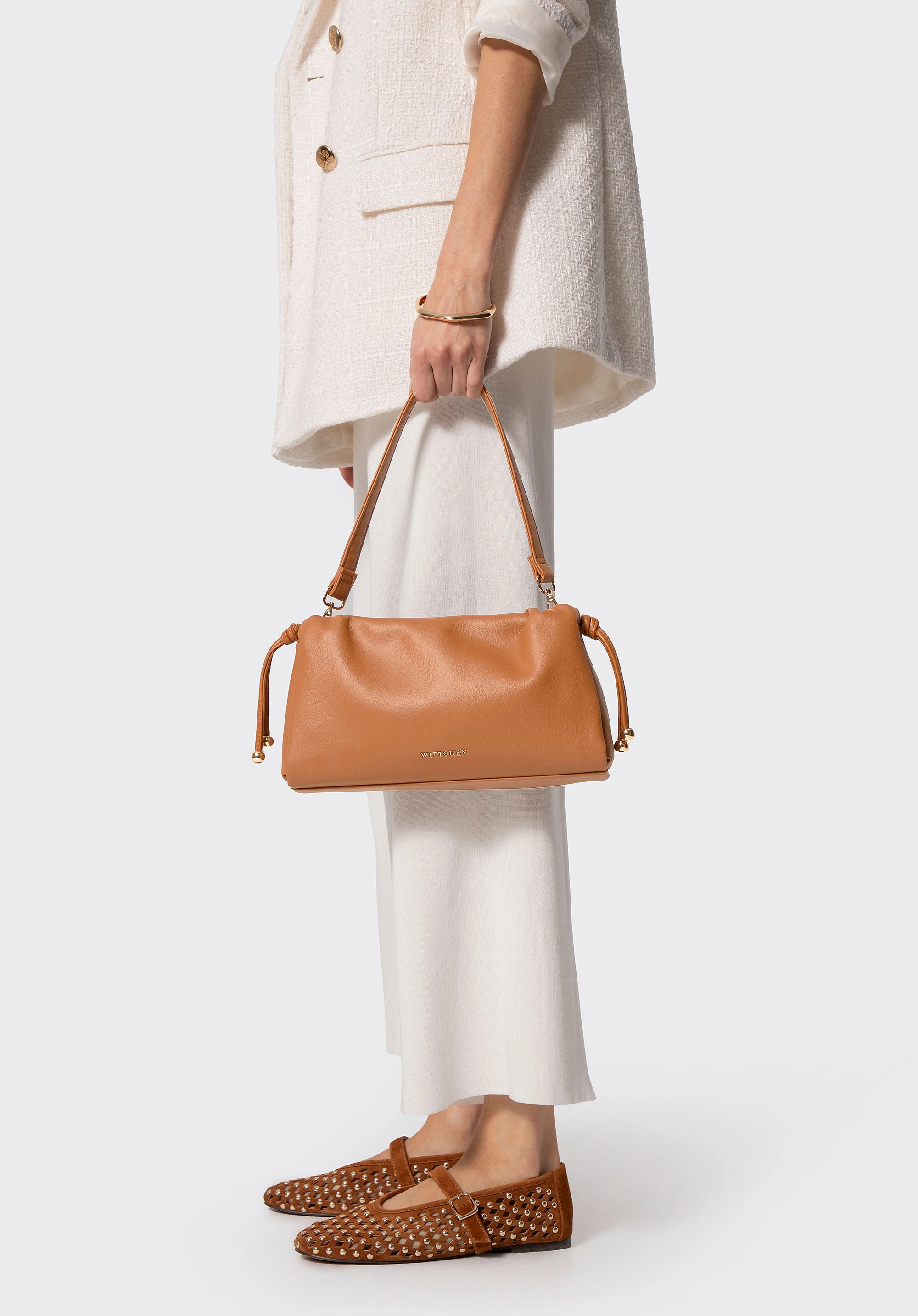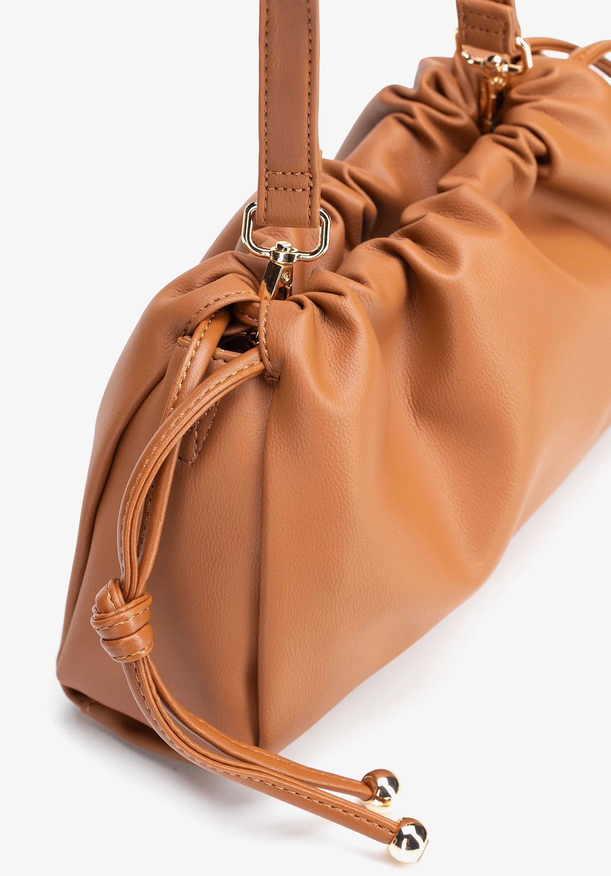 Wykonana ze skóry ekologicznej, torebka wyróżnia się subtelnym designem i łatwością pielęgnacji. Regulowany fason z troczkiem umożliwia zmianę kształtu – od miękkiej, swobodnej postaci po bardziej uporządkowaną formę. Dzięki odpinanej rączce i regulowanemu paskowi możesz nosić ją na ramię, crossbody lub w dłoni – dokładnie tak, jak potrzebujesz.