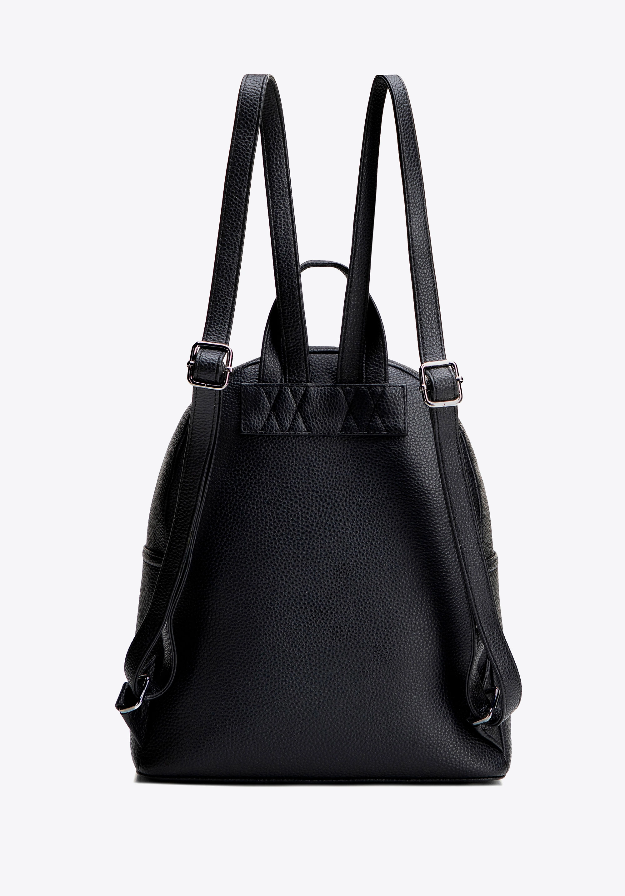 Plecak posiada bezpieczne zapięcie na suwak, które chroni zawartość podczas ruchu. Wnętrze zostało wyposażone w dwie praktyczne kieszenie, w tym jedną zapinaną, co ułatwia organizację najważniejszych rzeczy. Dodatkowa kieszeń z przodu z ozdobnym paskiem i metalowym zapięciem zapewnia szybki dostęp do drobiazgów.
