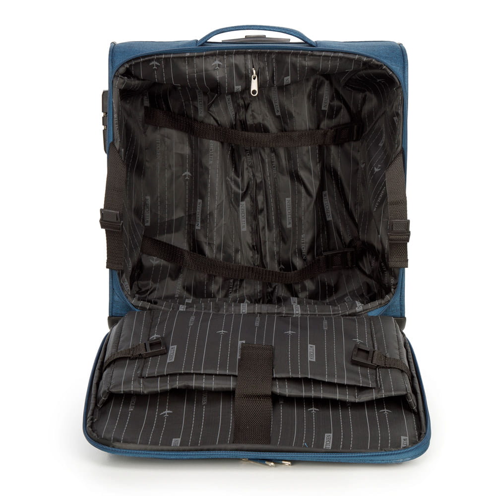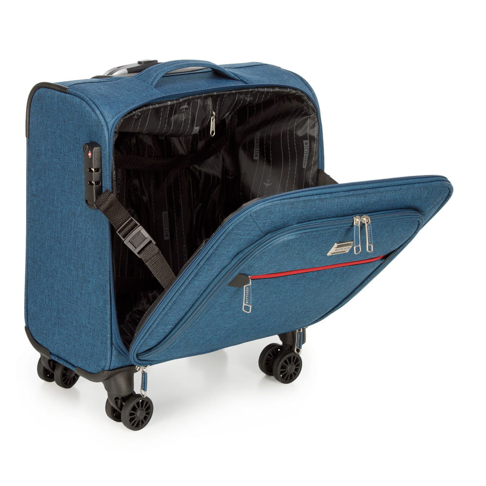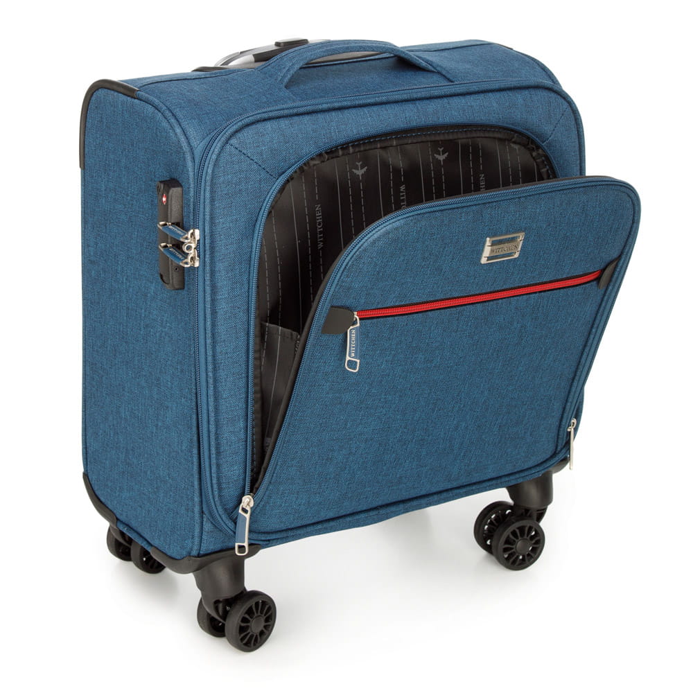 Mały neseser podróżny WITTCHEN 56-3S-505-91 z kolekcji Travel wykonany został z wytrzymałego poliestru w kolorze niebieskim. Neseser dzięki odpowiednim wymiarom spełnia wymogi bagażu podręcznego w większości tanich linii lotniczych (EasyJet, LOT, Lufthansa, Wizz Air, Aeroflot). Wyposażony jest w cztery podwójne kółka ułatwiające przemieszczenie, wysuwaną aluminiową rączkę, oraz dodatkowy uchwyt do ręki. Wewnątrz znajduje się komora z regulowanymi pasami zabezpieczającymi rzeczy przed przemieszczaniem, miękko wyścielana kieszeń na laptopa o maksymalnych wymiarach 24 cm x 35 cm, oraz otwarta kieszeń. Ponadto na zewnątrz jest 2 praktyczne kieszonki zamykane na suwak na akcesoria przydatne w podróży, które warto mieć zawsze pod ręką. Paski przytrzymujące klapę to dodatkowa zaleta tego modelu. Atutem jest również zabezpieczenie w postaci zamka TSA, dzięki któremu podczas rewizji bagażu przez służby celne mamy gwarancję bezinwazyjnego otwarcia walizki i jej ponownego zamknięcia, bez uszkodzenia zamka. Neseser WITTCHEN 56-3S-505-91 to wytrzymały i praktyczny bagaż, który zapewni wygodę i bezpieczeństwo podczas każdego wyjazdu.