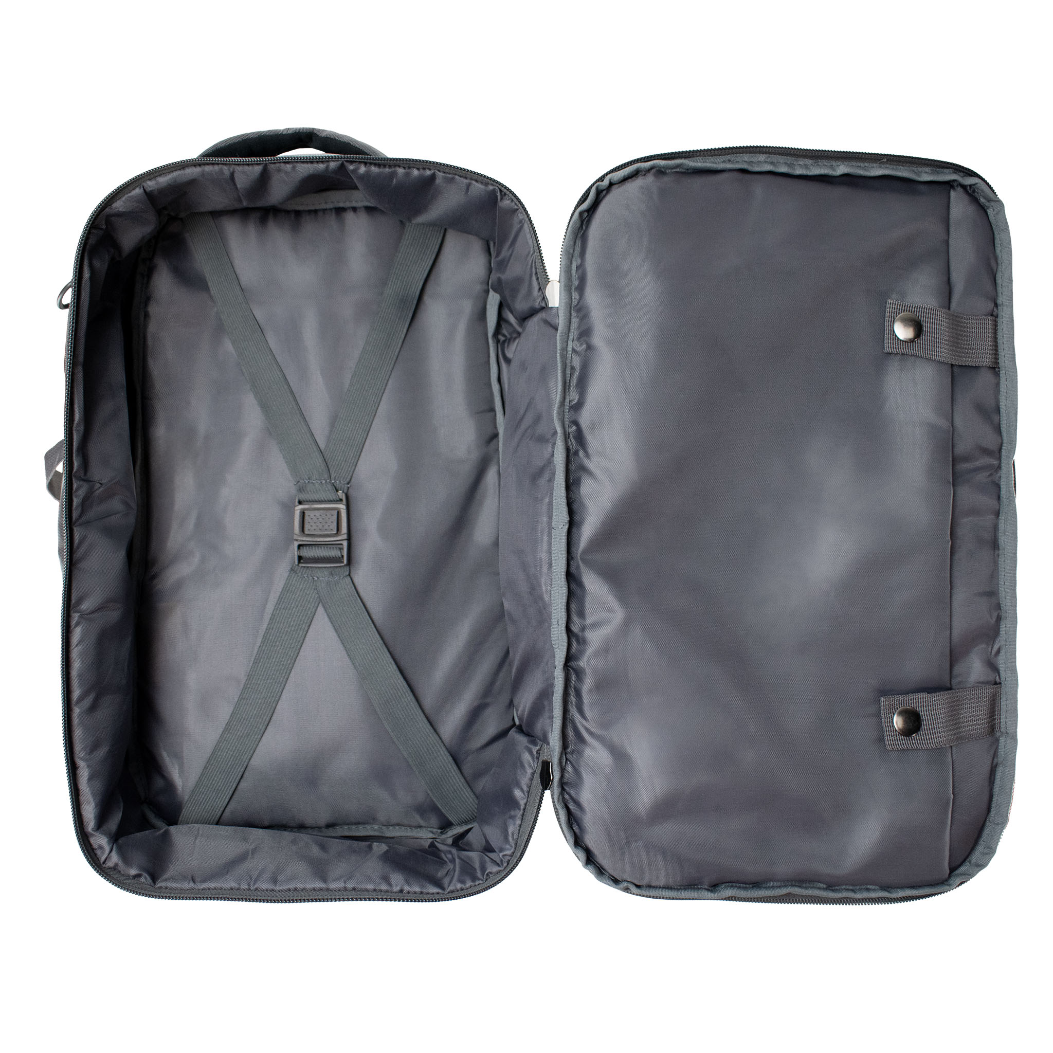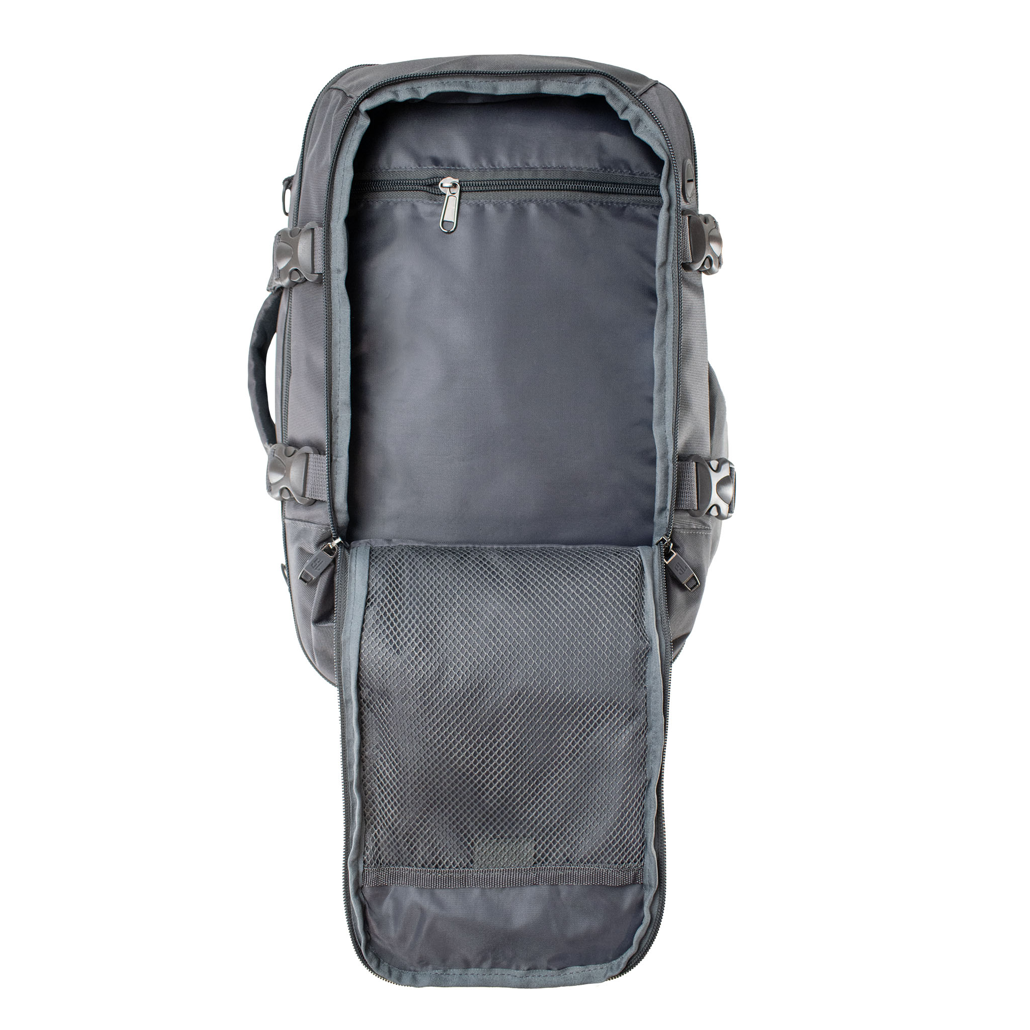 Plecak posiada dwie oddzielne komory, które bez problemu mieszczą format A4, co ułatwia organizację bagażu. Specjalna przegroda na laptopa do 14 cali zapewnia jego bezpieczne przechowywanie, a wewnętrzne pasy zabezpieczające ubrania chronią je przed przemieszczaniem się w trakcie podróży. Dodatkowe kieszenie – zarówno wewnętrzne (jedna z siatki i jedna na suwak), jak i zewnętrzne (dwie na zamek i jedna otwarta) – pozwalają uporządkować wszystkie niezbędne przedmioty. Boczna, otwarta oraz ukryta, tylna kieszeń na suwak to doskonałe miejsce na rzeczy, które chcesz mieć zawsze pod ręką.