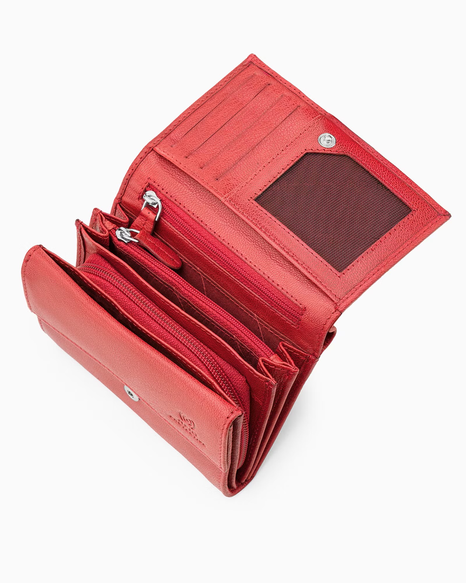 Wnętrze portfela zawiera cztery przegrody na karty, kieszeń na banknoty, siateczkowe okienko na zdjęcie oraz dwie kieszenie zapinane na zamek. Dodatkowo znajdziemy dwie kieszonki na bilon – jedną zamykaną zatrzaskiem, drugą na suwak – oraz praktyczne kieszenie otwarte na paragony i dokumenty.