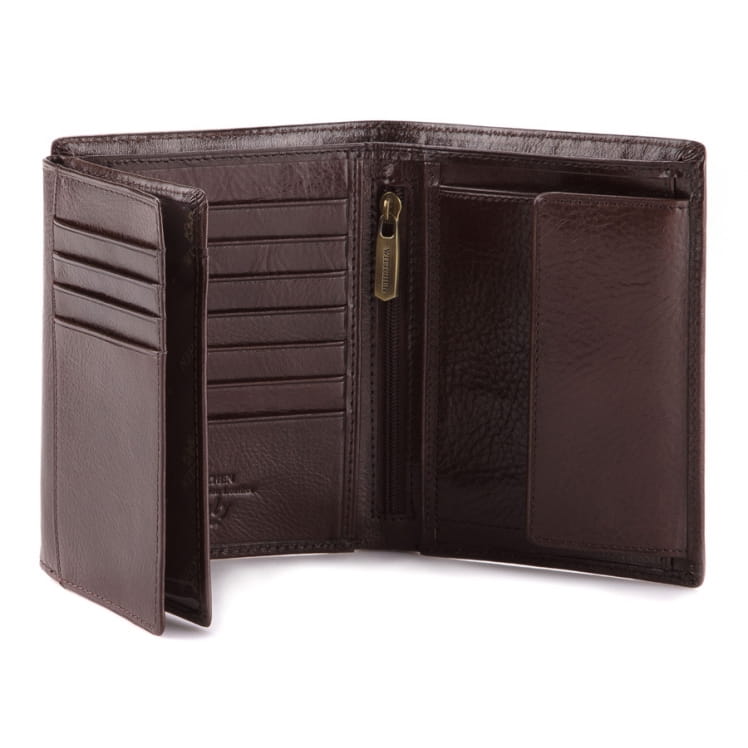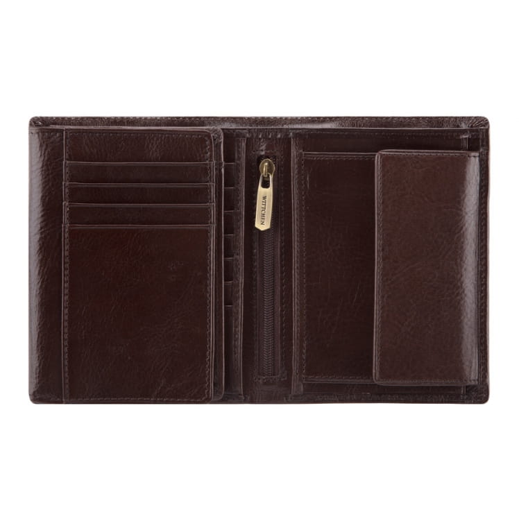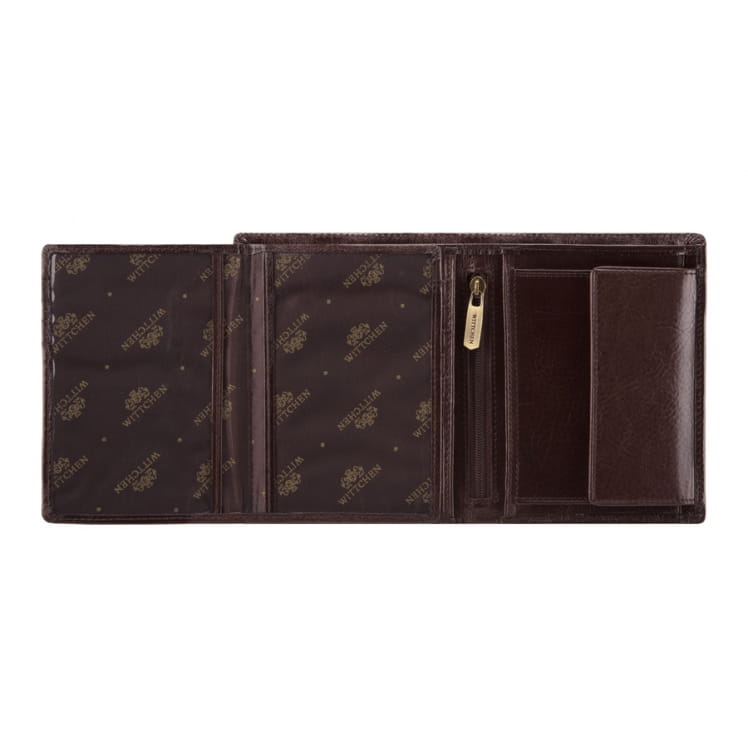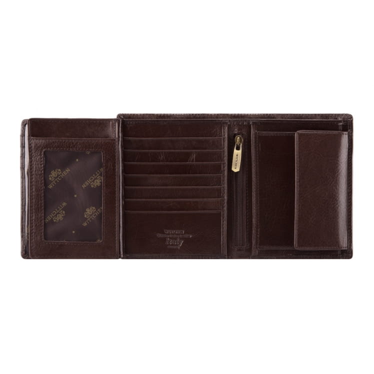Duży portfel męski WITTCHEN 21-1-221-4 z kolekcji Italy, bardzo starannie i estetycznie, ręcznie wykonany z miękkiej skóry cielęcej w kolorze brązowym. Logo w postaci herbu WITTCHEN wytłoczonego w skórze podkreśla jego klasę i elegancję. Wewnątrz znajduje się miejsce na bilon, 2 kieszenie na banknoty, 11 miejsc na karty kredytowe oraz 6 kieszeni, w tym 3 przezroczyste i 1 zamykana na zamek. Duża liczba kieszeni czyni portfel bardzo pojemnym i funkcjonalnym, a wielkość pozwala na pomieszczenie dowodu rejestracyjnego.