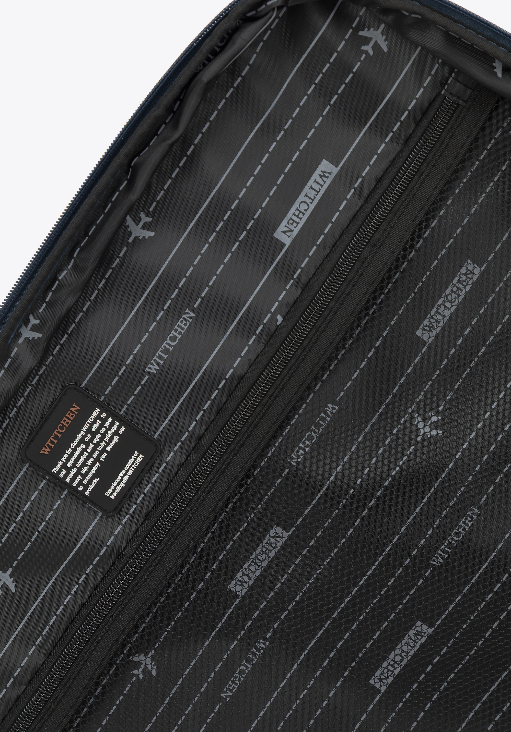 Wnętrze walizki zaprojektowano z myślą o maksymalnej organizacji – komora główna z pasami zabezpieczającymi oraz przegroda z kieszenią z siatki pomagają utrzymać porządek. Dodatkowo trzy zewnętrzne kieszenie na suwak umożliwiają szybki dostęp do dokumentów i drobiazgów.