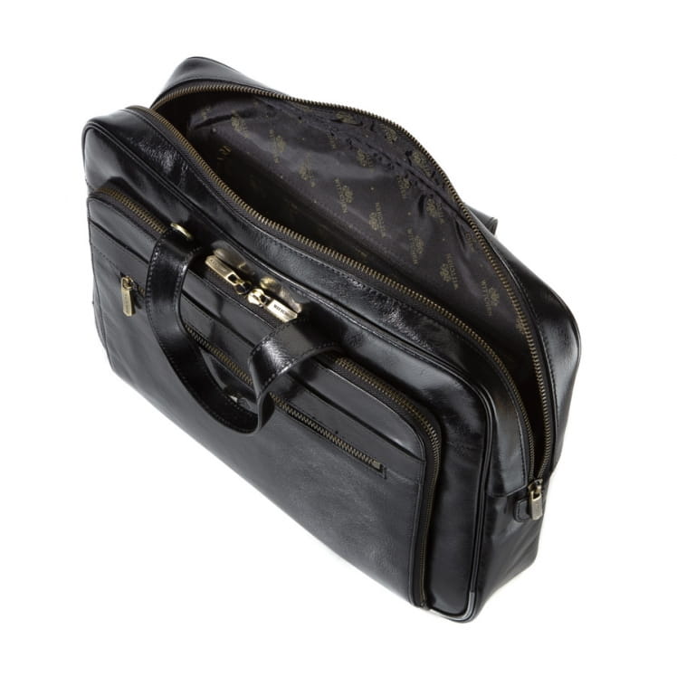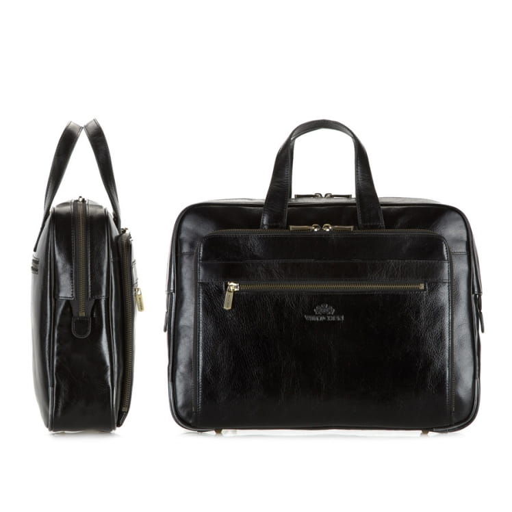 Elegancka torba na laptopa WITTCHEN Italy 21-3-314-1 ręcznie wykonana z najwyższej jakości miękkiej skóry cielęcej w kolorze czarnym. Torba posiada wewnątrz jedną komorę zamykaną na suwak, mieszczącą urządzenie o maksymalnych wymiarach 25 cm x 36 cm i kieszeń zamykaną na suwak. W przedniej kieszeni zamykanej na suwak znajduje się otwarta kieszeń, 3 miejsca na długopisy, 4 miejsca na karty kredytowe oraz miejsce na telefon komórkowy. Z przodu oraz z tyłu znajdują się dodatkowe kieszenie zamykane na suwak. Do teczki dołączony jest odpinany, regulowany pas nośny oraz skórzana zawieszka z miejscem na dane osobowe. Podstawa torby jest zabezpieczona metalowymi nóżkami. Logo w postaci herbu WITTCHEN wytłoczone w skórze na przedniej kieszeni podkreśla ekskluzywny charakter torby.