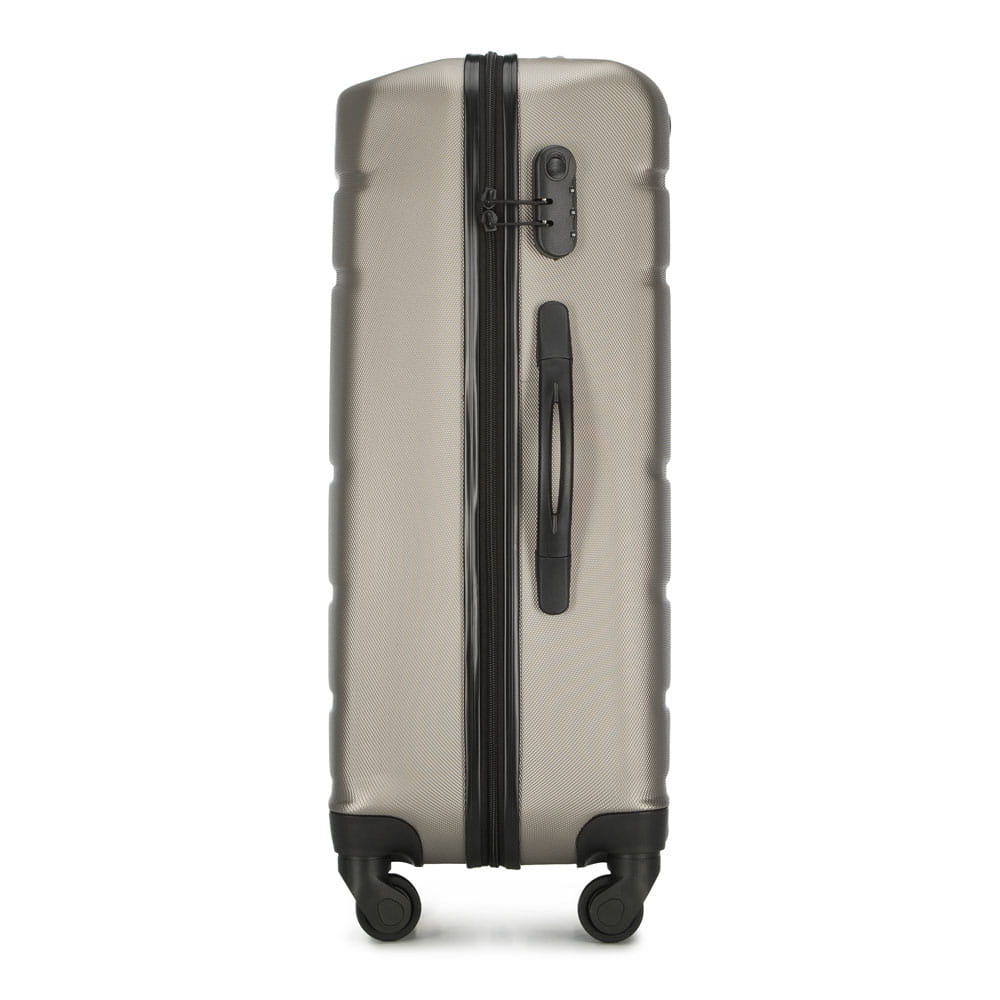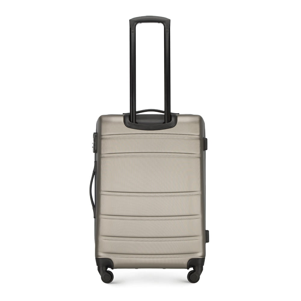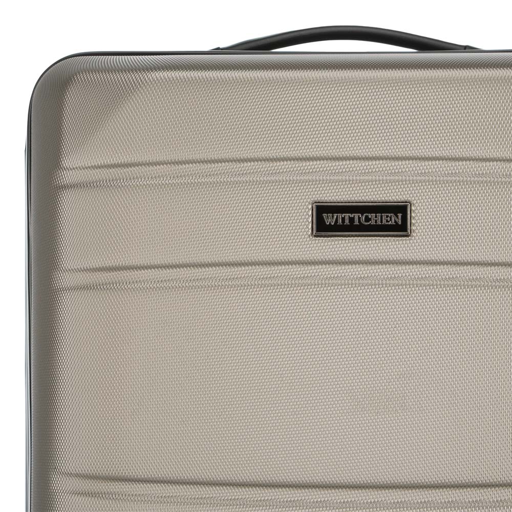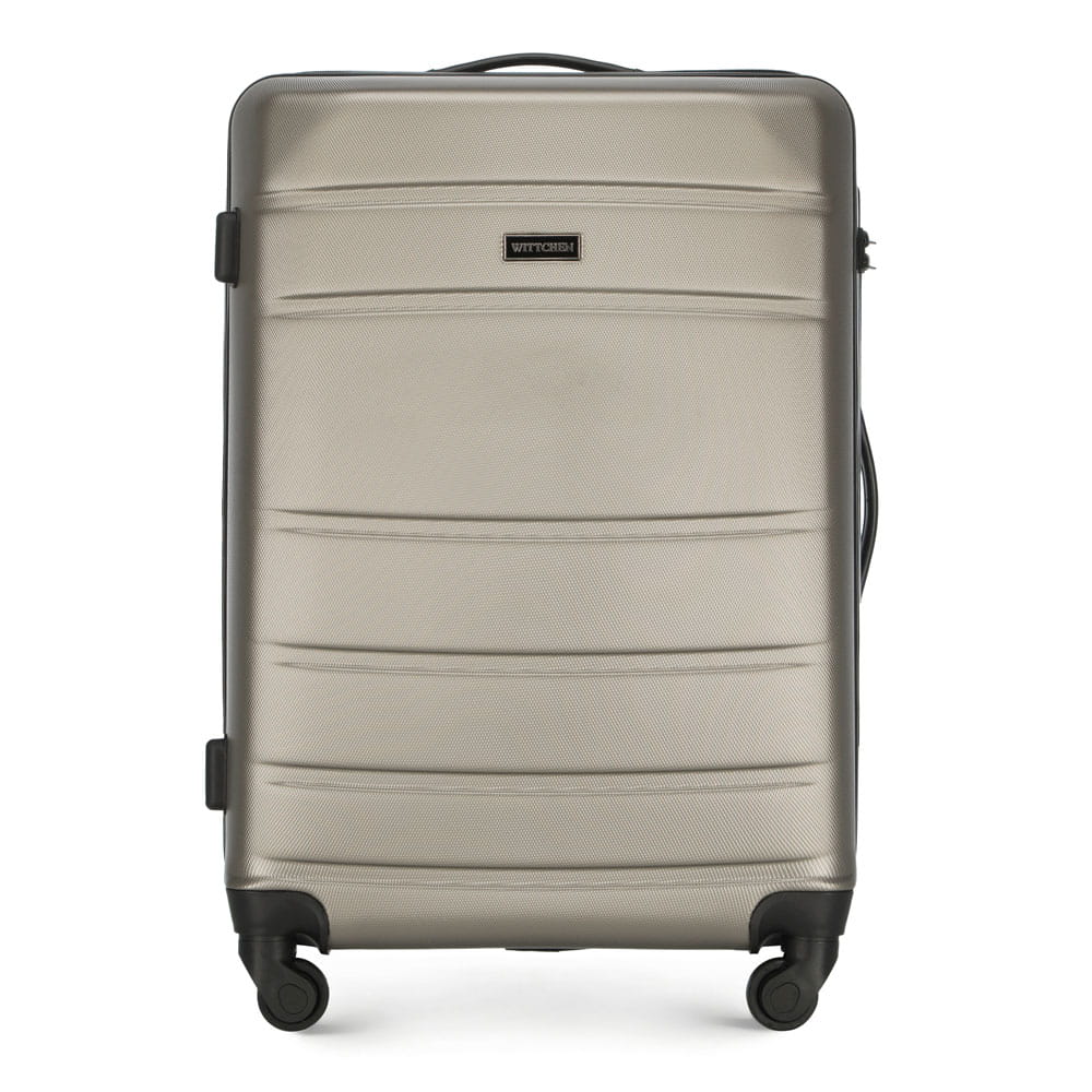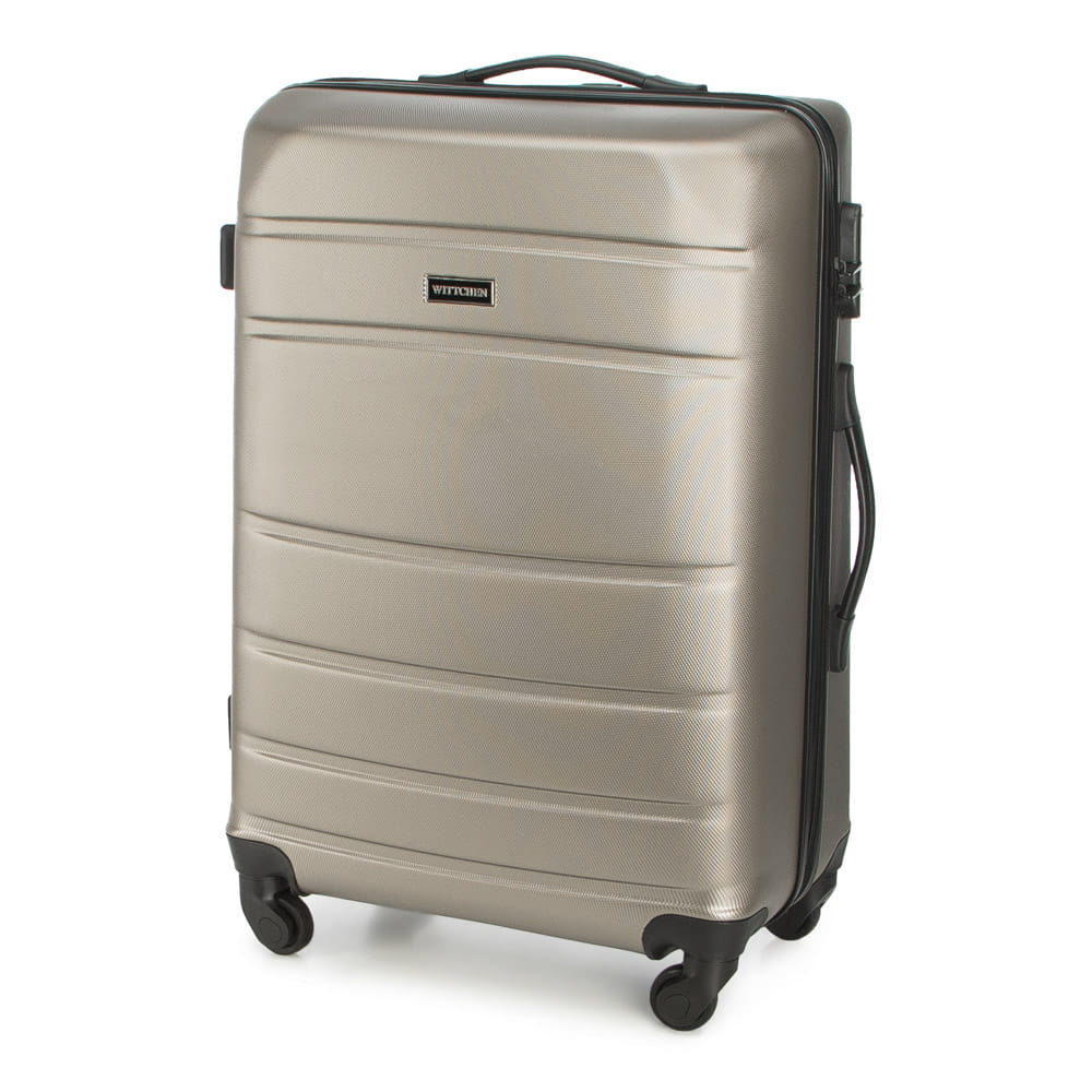 Walizka średnia WITTCHEN 56-3A-652-86 w kolorze szampańskim, z kolekcji Globe line wykonana została z ABS-u, który charakteryzuje się wysoką odpornością na uszkodzenia i zadrapania. Walizka wyposażona jest w cztery obrotowe kółka ułatwiające przemieszczenie się z bagażem, wysuwaną aluminiową rączkę, oraz 2 gumowe uchwyty do ręki. Wewnątrz walizki znajduje się komora główna z elastycznymi pasami zabezpieczającymi rzeczy przed przemieszczaniem, komora zamykana na suwak i 2 kieszenie, jedna z siatki i druga mniejsza, obie zamykane na zamek. Dostęp do wnętrza przez osoby niepożądane uniemożliwia wyposażenie walizki w klasyczny zamek szyfrowy, który jest dodatkową zaletą bagażu.