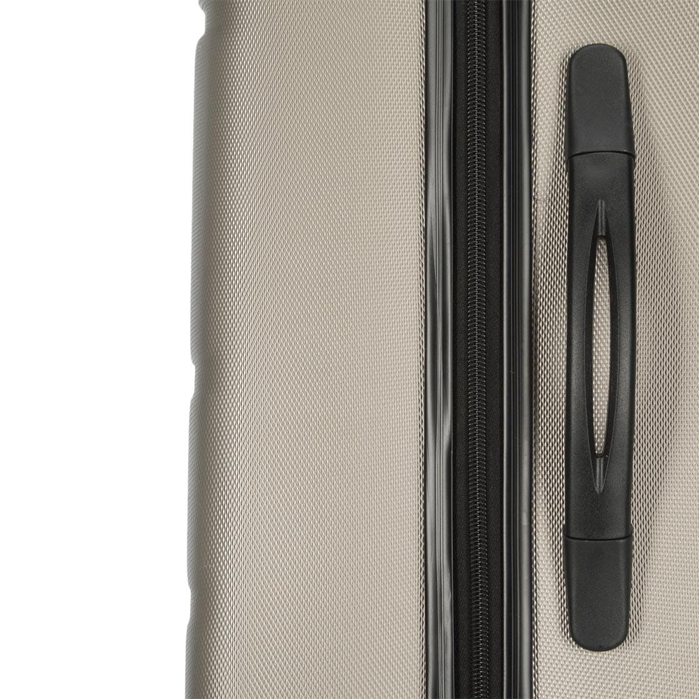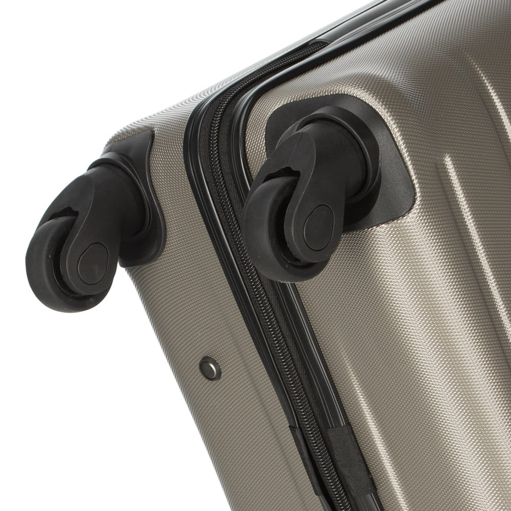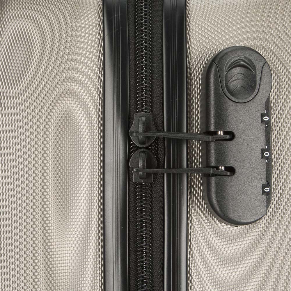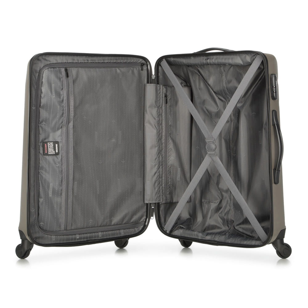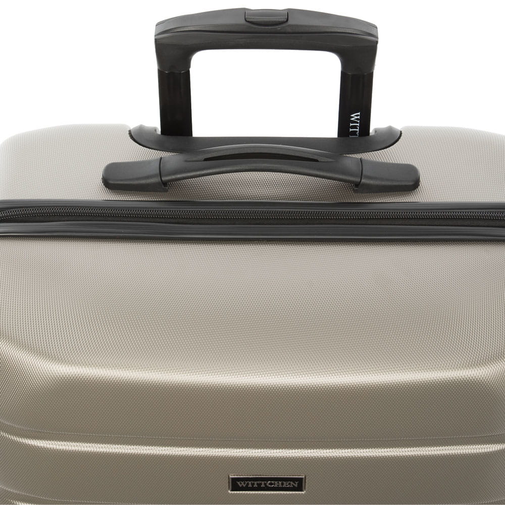 Walizka średnia WITTCHEN 56-3A-652-86 w kolorze szampańskim, z kolekcji Globe line wykonana została z ABS-u, który charakteryzuje się wysoką odpornością na uszkodzenia i zadrapania. Walizka wyposażona jest w cztery obrotowe kółka ułatwiające przemieszczenie się z bagażem, wysuwaną aluminiową rączkę, oraz 2 gumowe uchwyty do ręki. Wewnątrz walizki znajduje się komora główna z elastycznymi pasami zabezpieczającymi rzeczy przed przemieszczaniem, komora zamykana na suwak i 2 kieszenie, jedna z siatki i druga mniejsza, obie zamykane na zamek. Dostęp do wnętrza przez osoby niepożądane uniemożliwia wyposażenie walizki w klasyczny zamek szyfrowy, który jest dodatkową zaletą bagażu.