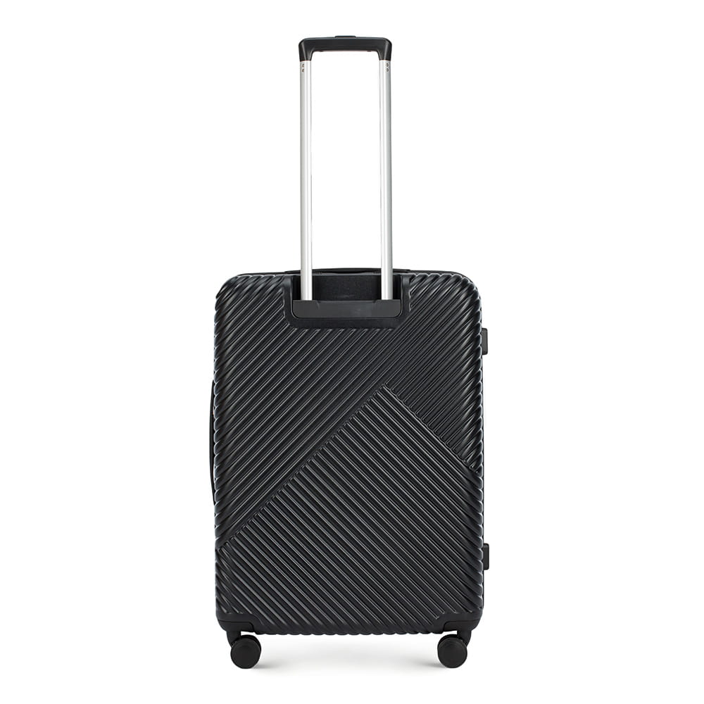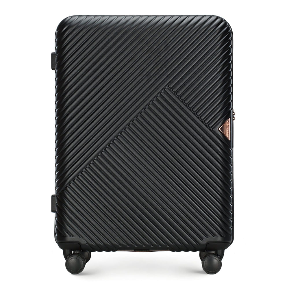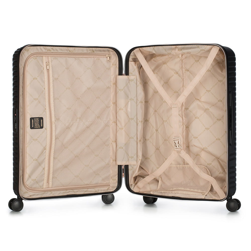 Średnia walizka WITTCHEN 56-3P-842-10 z kolekcji GL Style w kolorze czarnym, wykonana z policarbonu z matowym wykończeniem. Walizka wyposażona jest w cztery podwójne kółka wykonane z tworzywa ABS i pokryte termoplastyczną powłoką, aluminiową, teleskopową rączkę z blokadą oraz i 2 gumowe, elastyczne uchwyty do ręki. Wewnątrz znajduje się komora z regulowanymi pasami zabezpieczającymi bagaż przed przemieszczaniem, komora zamykana na zamek oraz 3 kieszenie zamykane na suwak, w tym 2 z siatki. Zabezpieczenie w postaci zamka TSA to dodatkowy atut. Dzięki niemu podczas rewizji bagażu przez służby celne mamy gwarancję bezinwazyjnego otwarcia walizki i jej ponownego zamknięcia, bez uszkodzenia zamka. Walizka jest lekka, a przy tym pojemna i praktyczna.